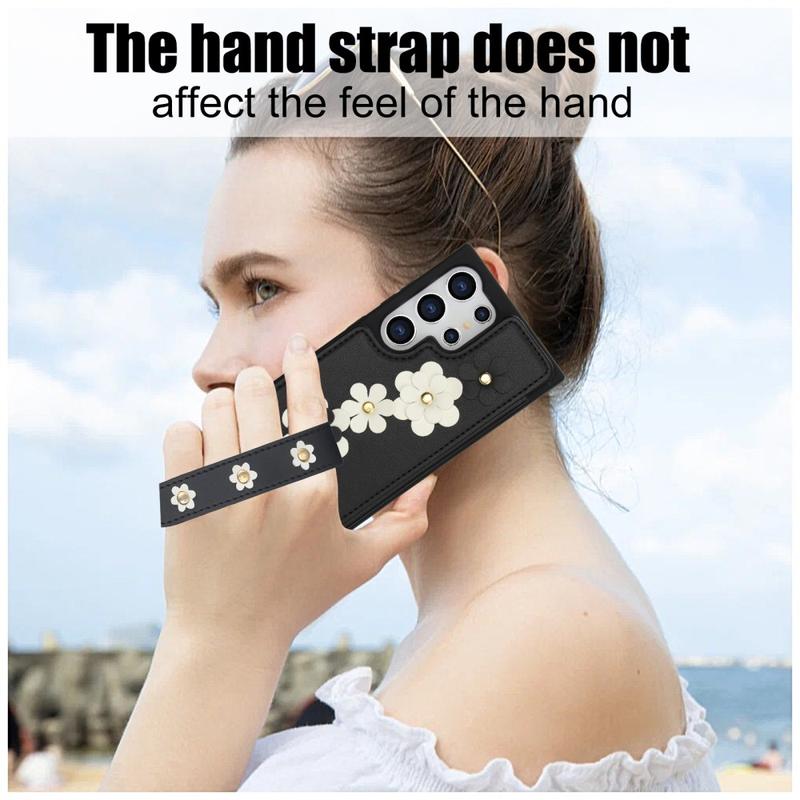 Samsung Galaxy S24 Ultra Blomsterdekoration Cover med Rem - Sort