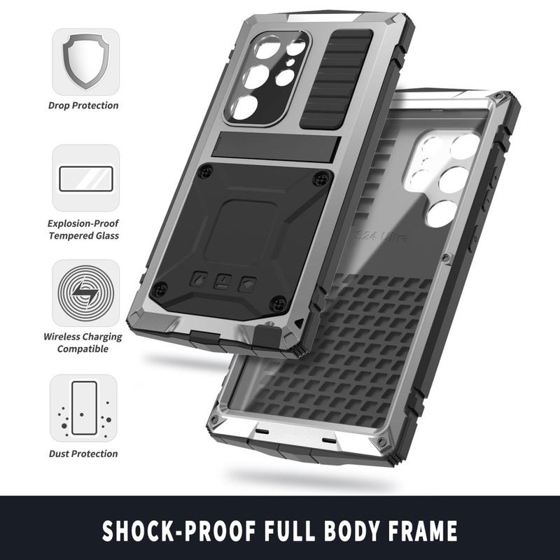 Oplev uovertruffen beskyttelse og funktionalitet med R-Just Case til Samsung Galaxy S25 Ultra. Dette hybrid-etui er bygget til holdbarhed og kombinerer pc-, silikone- og metalmaterialer til omfattende beskyttelse mod hverdagens slitage. Med sin integrerede kickstand og medfølgende hærdede glasfilm tilbyder dette etui førsteklasses funktionalitet uden at gå på kompromis med stilen. Det er designet til den moderne bruger og er det ideelle tilbehør til at beskytte din enhed, samtidig med at det bevarer en elegant æstetik.
