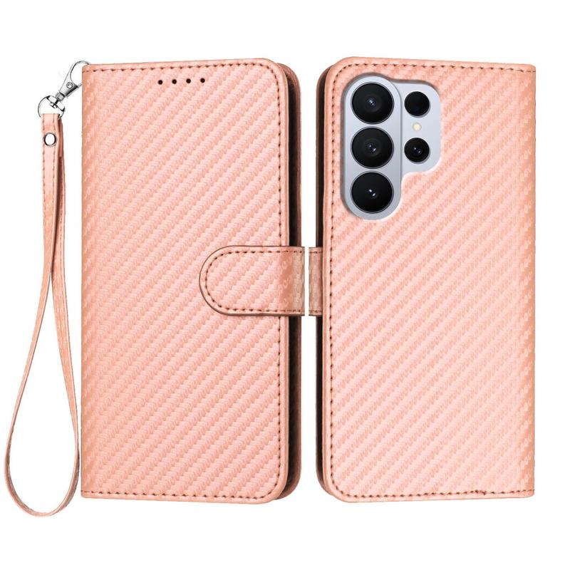 Samsung Galaxy S26 Ultra Premium Wallet-etui med rem - kulfiberstruktur - Kulstoflyserød