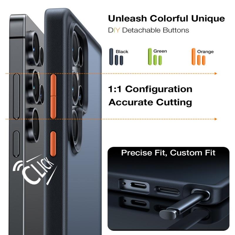 Etuiet indeholder tre farvesæt med udskiftelige knapper, så du kan gøre din Samsung Galaxy S26 Ultras udseende personligt. Du kan nemt udskifte knapperne, så de passer til din stil, dit outfit eller dit humør, og skabe et unikt, tilpasset udseende.
