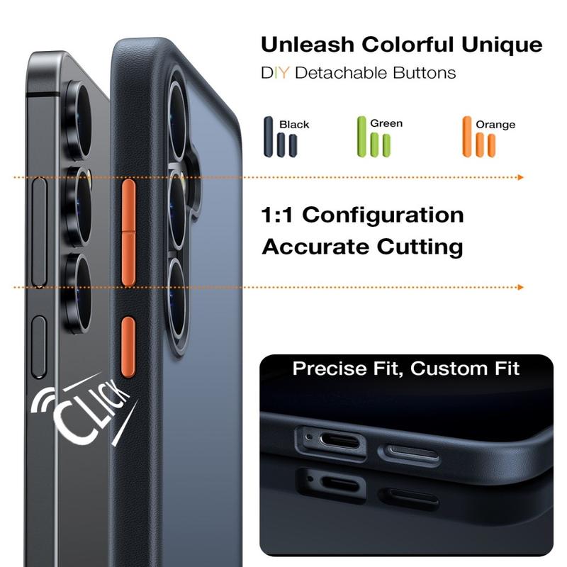 Etuiet indeholder tre farvesæt med udskiftelige knapper, så du kan gøre din Samsung Galaxy S26+s udseende personligt. Du kan nemt udskifte knapperne, så de passer til din stil, dit outfit eller dit humør, og skabe et unikt, tilpasset udseende.