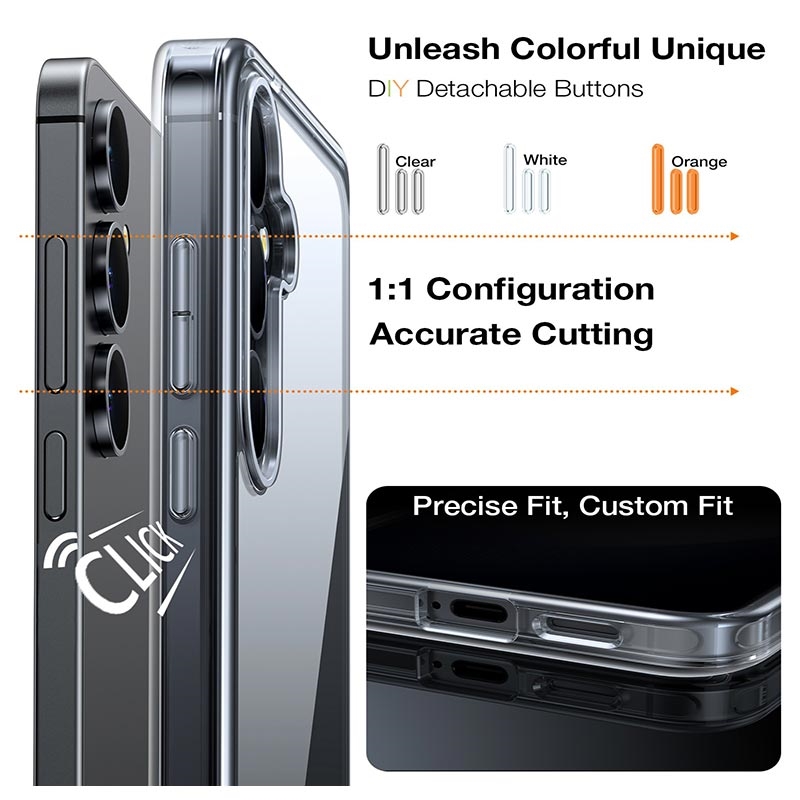 Etuiet indeholder tre farvesæt med udskiftelige knapper, så du kan gøre din Samsung Galaxy S26s udseende personligt. Du kan nemt udskifte knapperne, så de passer til din stil, dit outfit eller dit humør, og skabe et unikt, tilpasset udseende.