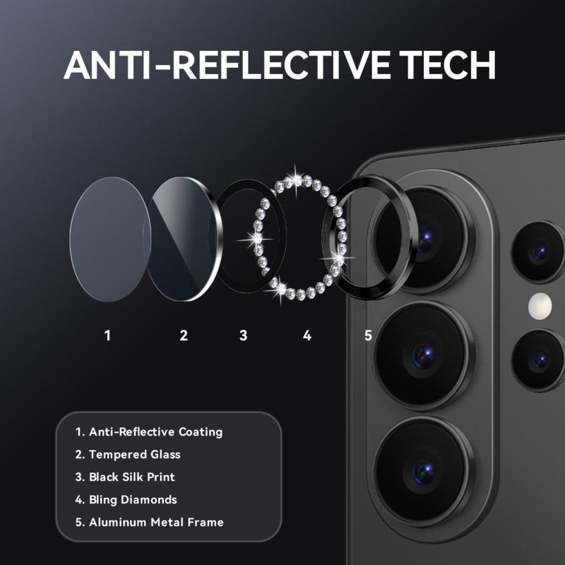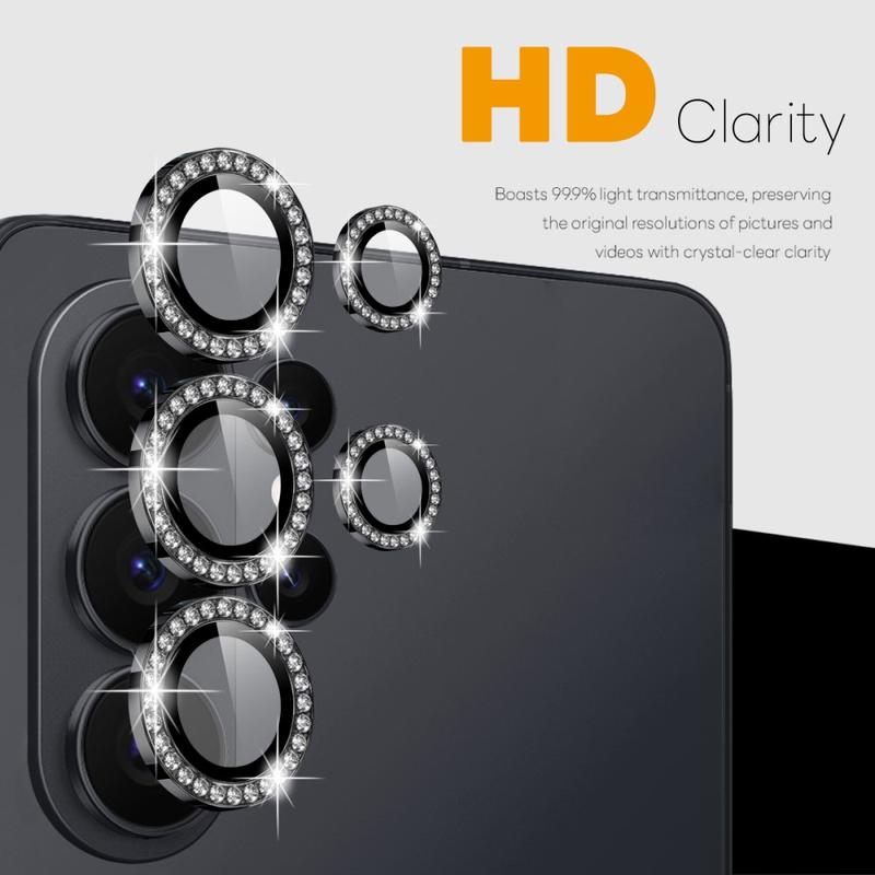 Tilføj glitter og beskyttelse til din Samsung Galaxy S26 Ultra med NORTHJO Camera Lens Protector. Den er designet med glitrende rhinsten og præcisionsskåret hærdet glas og beskytter din kameralinse mod ridser, støv og stød, samtidig med at den giver et strejf af elegance og luksus.