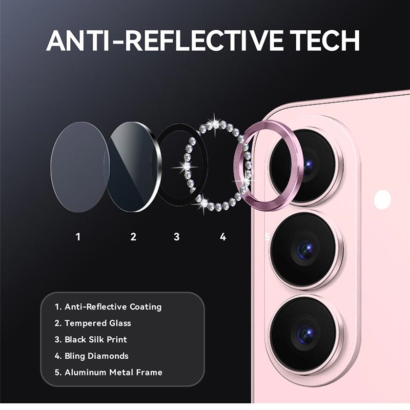 - Funklende rhinestone-design - Dekoreret med krystallignende rhinestones, der fanger lyset og forvandler dit kameraområde til et stilfuldt fokuspunkt.