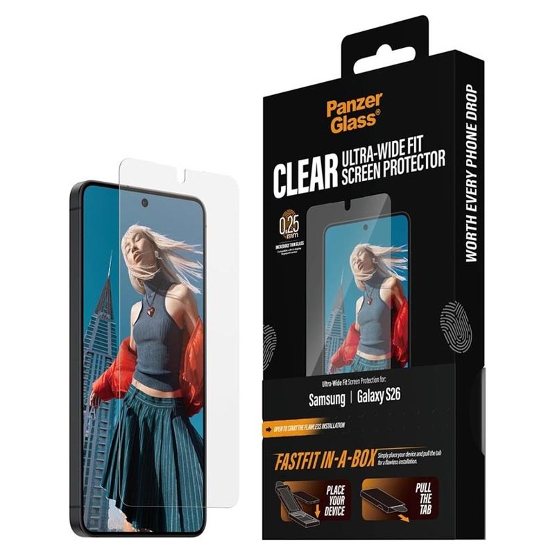 PanzerGlass Ultra-Wide Fit Screen Protector til Samsung Galaxy S26 er designet til hurtig, boblefri installation takket være det innovative FASTFIT IN-A-BOX-system. Du skal blot placere din Samsung Galaxy S26 med forsiden opad, trække i fanen og nyde en perfekt justeret beskyttelse hver gang - intet støv, ingen frustration.