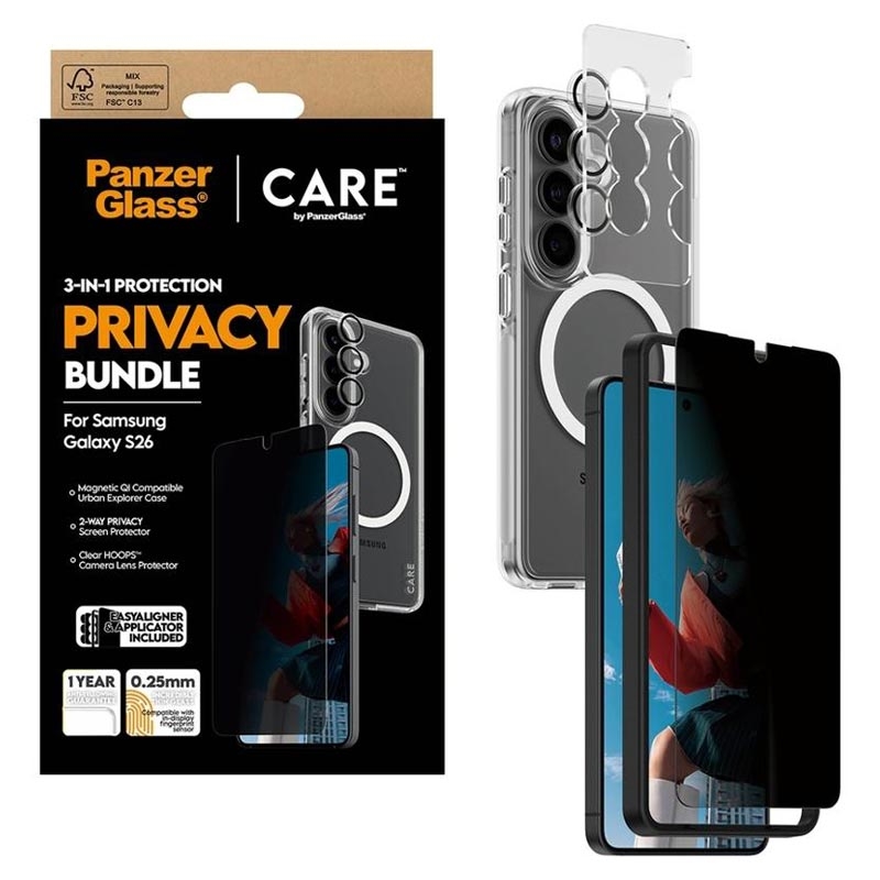 Care by PanzerGlass 3-i-1 privatlivspakke til Samsung Galaxy S26 - privatlivsskærmbeskytter, Hoops-linsebeskytter, CARE Urban Combat-etui (3,6 m), EasyAligner