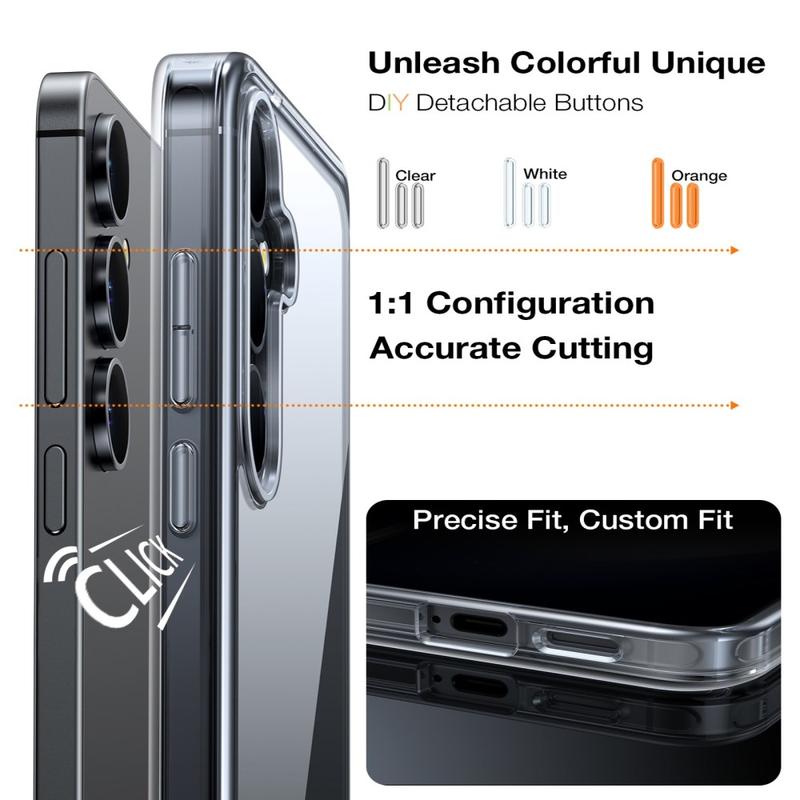 Etuiet indeholder tre farvesæt med udskiftelige knapper, så du kan gøre din Samsung Galaxy S26+s udseende personligt. Du kan nemt udskifte knapperne, så de passer til din stil, dit outfit eller dit humør, og skabe et unikt, tilpasset udseende.