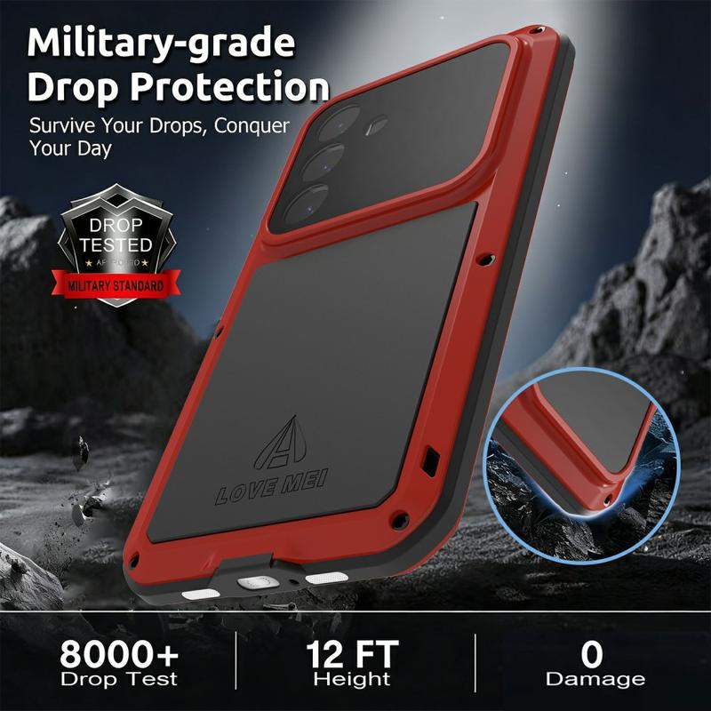 Love Mei-serien er inspireret af militær- og industriteknik og bruger flerlagsbeskyttelse med metalrammer og silikonedæmpning - en struktur, der kan modstå fald på over 2 meter og samtidig bevare touchskærmens følsomhed.