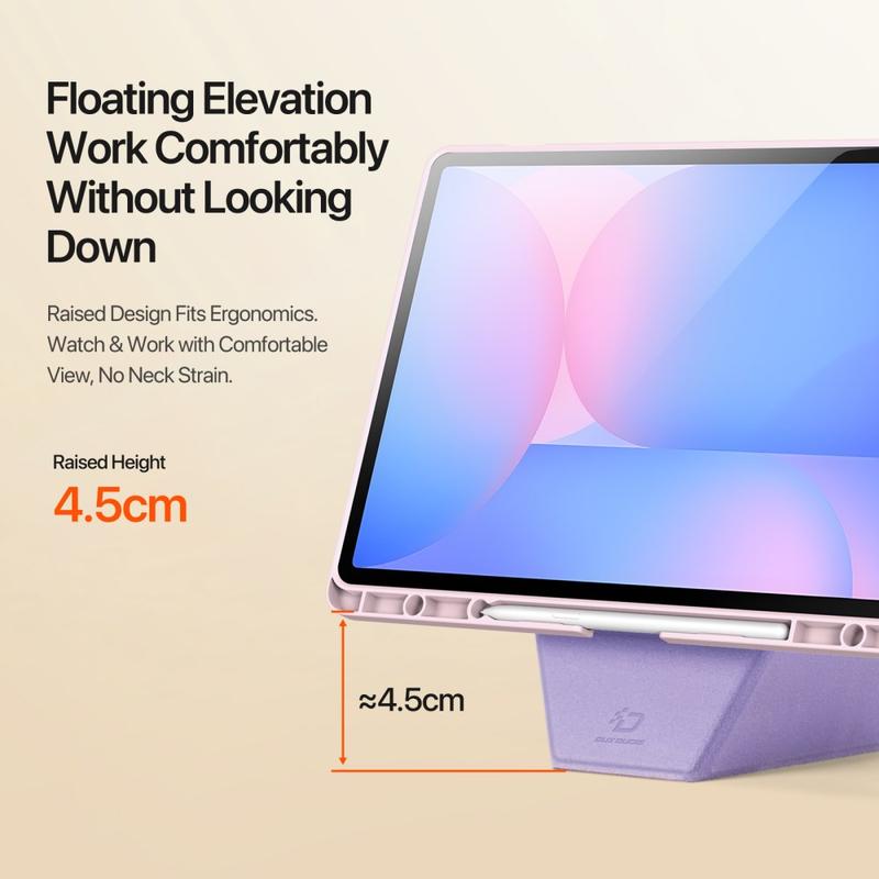 Gør din Samsung Galaxy Tab S10 FE+ til en virkelig alsidig arbejdsstation. DUX DUCIS Vers Series-etuiet løfter tabletten ca. 4,5 cm, så den kan ses uden anstrengelse, beskytter den mod daglige stød og glider let ned i enhver taske takket være den fjerlette konstruktion. Fra binge-watching til skitsering - dette foldbare cover tilpasser sig på få sekunder.