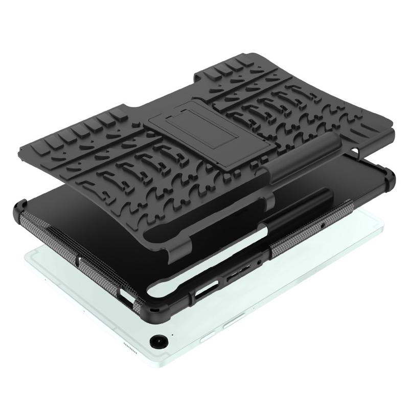 Det hårde ydre lag gør din Samsung Galaxy Tab S10 FE, Galaxy Tab S9 FE mindre tilbøjelig til at blive bøjet, mens dets indre lag beskytter den fra fald og skader. Oven på det, giver det indbyggede stativ en komfortabel oplevelse når du skal se videoer på din Samsung Galaxy Tab S10 FE, Galaxy Tab S9 FE.