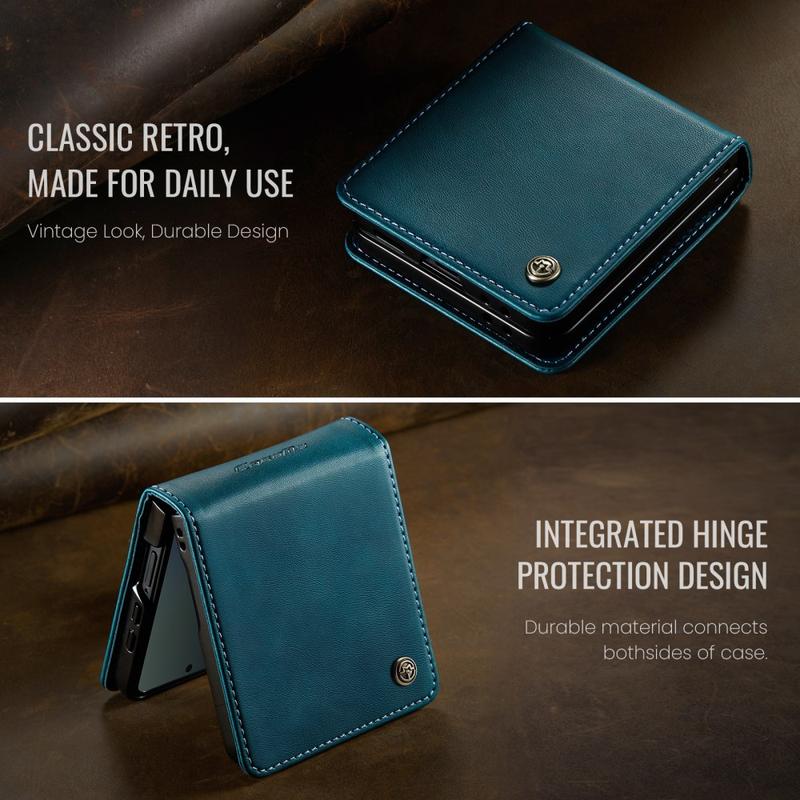 CASEME 033-serien af pungcovers til Samsung Galaxy Z Flip7 er fremstillet af kalvestruktureret polyurethan kombineret med TPU, der giver fuld beskyttelse mod ridser, stød og daglig brug, samtidig med at det bevarer et førsteklasses og elegant look.