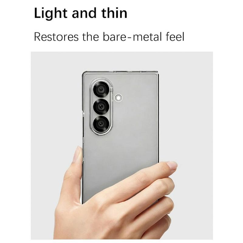 Dette Samsung Galaxy Z TriFold-etui kombinerer smart funktionalitet med et slankt, moderne design. Det er lavet af holdbart PC-materiale og beskytter din enhed mod hverdagens ridser og mindre stød, samtidig med at det er let og behageligt at holde på. Den krystalklare finish bevarer telefonens oprindelige udseende og giver stilfuld gennemsigtighed uden at fylde for meget.