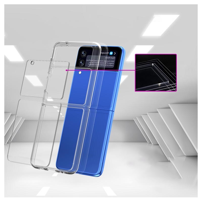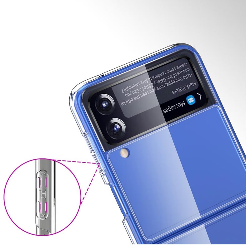 - Dette beskyttende og gennemsigtige hard PC telefonbagcover er specielt designet til Samsung Galaxy Z Flip 3 og tilbyder en perfekt kombination af stil og beskyttelse. Med sin præcise pasform og højkvalitetsmaterialer, sikrer dette cover, at din telefon forbliver sikker mod ridser, stød og andre daglige skader.