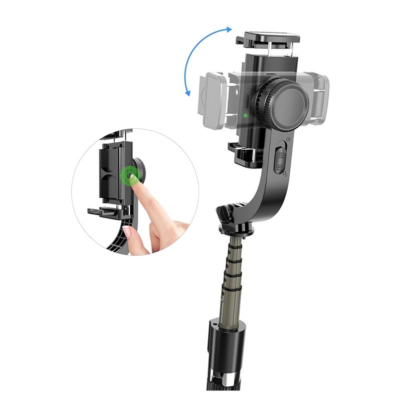 Rigtig fin tripod med gimbal stabilisator til en billig pris. Den kan både vendes lodret og vandret. Drej blot stabilisatoren til ønsket position og afvent til stabilisatoren har registreret det.Vær opmærksom ved opladning af stabilisatoren, at ledningen som sættes i, trykker tænd knappen ned, så man kommer til at oplade mens stabilisatoren er tændt = stabilisator oplader ikke. Det kan løses ved at trykke tænd knappen ned, mens ledningen sættes i.