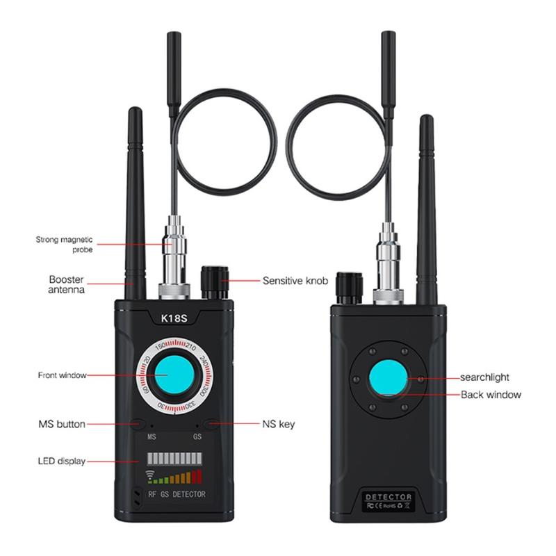 RF-detektorer som K18s bruger radiofrekvensscanning og optiske linsefiltre til at identificere skjulte enheder. Metoden med refleksion af rødt lys, der bruges til linsedetektering, svarer til teknikker, der anvendes i professionelle kontraovervågningsoperationer.
