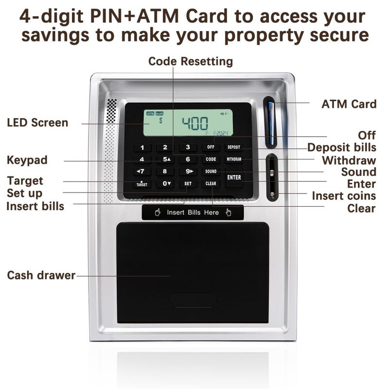 - Multifunktionelt hæveautomatlegetøj: Simulerer rigtige hæveautomatoperationer med stemmemeddelelser, automatisk balanceberegning, møntgenkendelse og opsparingsmålsætning.