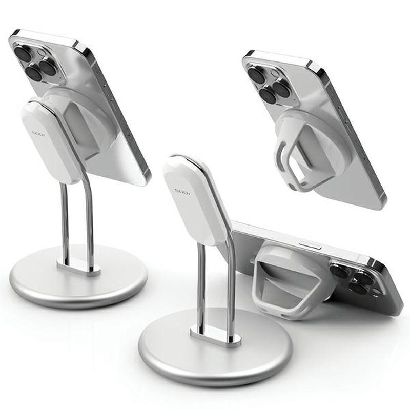 SODI SIM300 Magnetic Phone Stand har et unikt design inspireret af arkitektonisk æstetik og tilbyder både funktionalitet og stil. Den er fremstillet af en aluminiumslegering af høj kvalitet og bløde silikonepuder og giver en stabil og ridsefri støtte til din telefon. Standerens magnetiske holder er aftagelig, så den kan bruges separat eller erstattes med en trådløs iPhone MagSafe-oplader (medfølger ikke).