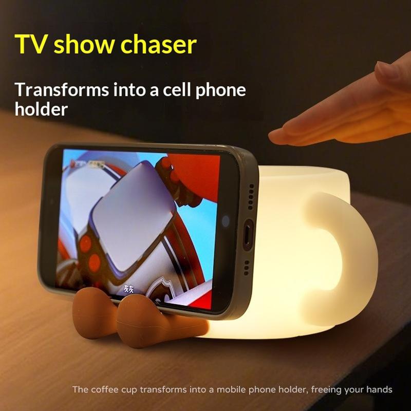 Sød kaffekop-natlampe med telefonholder - Trykbetjent 7-farvet LED-lampe, 3 varme lysstyrkeniveauer, 30 minutters timer, USB-C-genopladelig