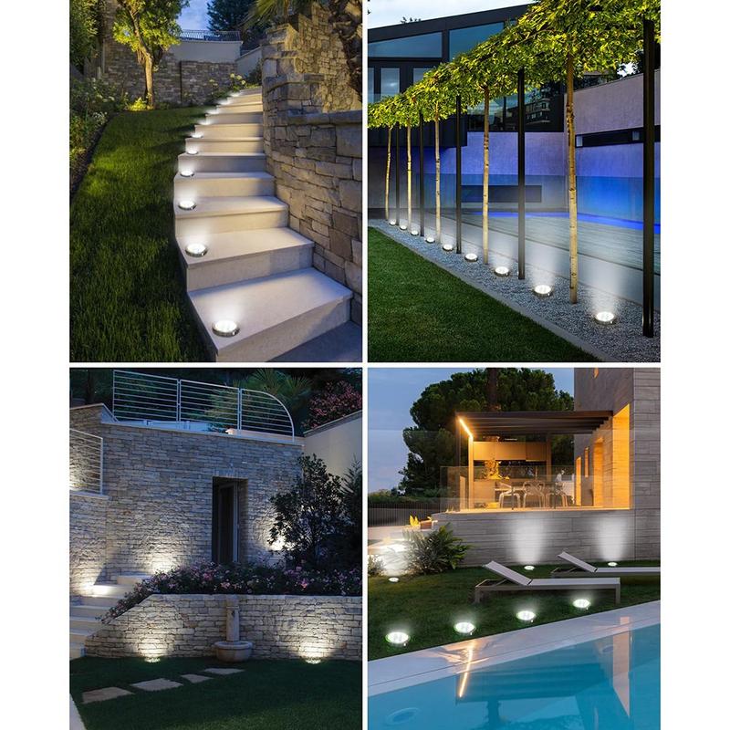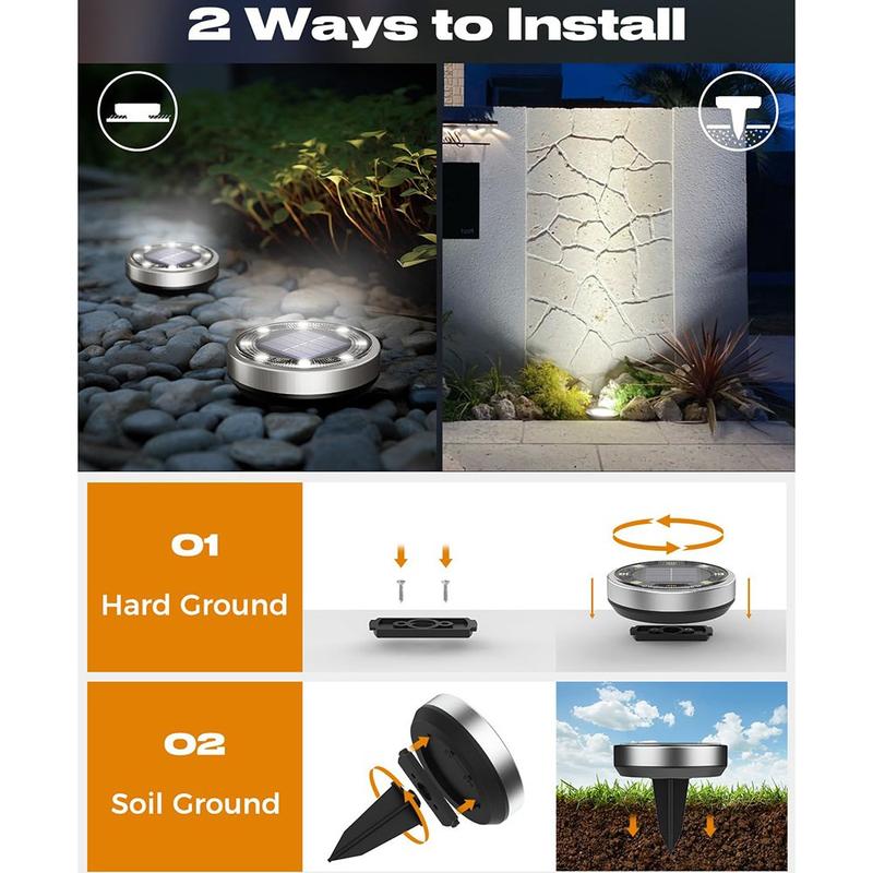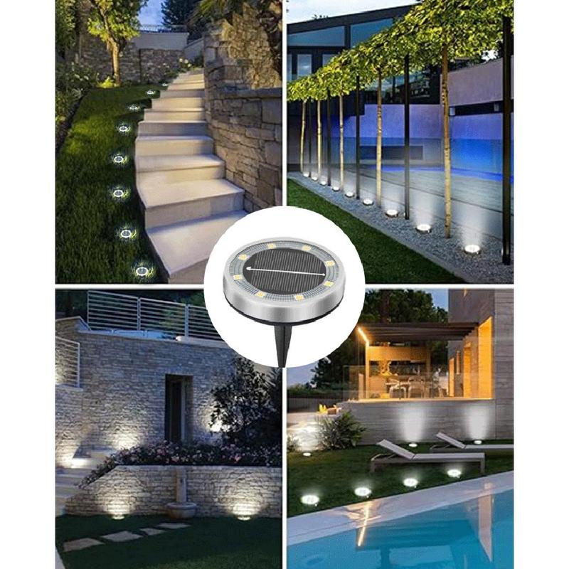 Skab et elegant, energifrit lys langs stier, terrasser og blomsterbede med dette sæt solcellelamper med 12 dele. Hver skive gemmer på otte lysende hvide LED'er under børstet rustfrit stål, der oplades lydløst om dagen og tændes automatisk i skumringen. Med enkel montering med skruer eller spyd og IP65-beskyttelse giver de stemning året rundt i Europas forskellige klimaer - ingen ledninger, ingen elomkostninger.