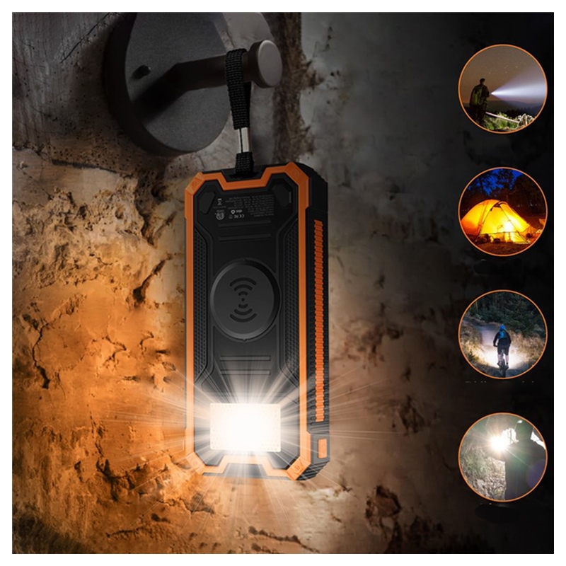 - Leveres med et nødlys til camping, vandreture osv. med trådløs opladningsfunktion