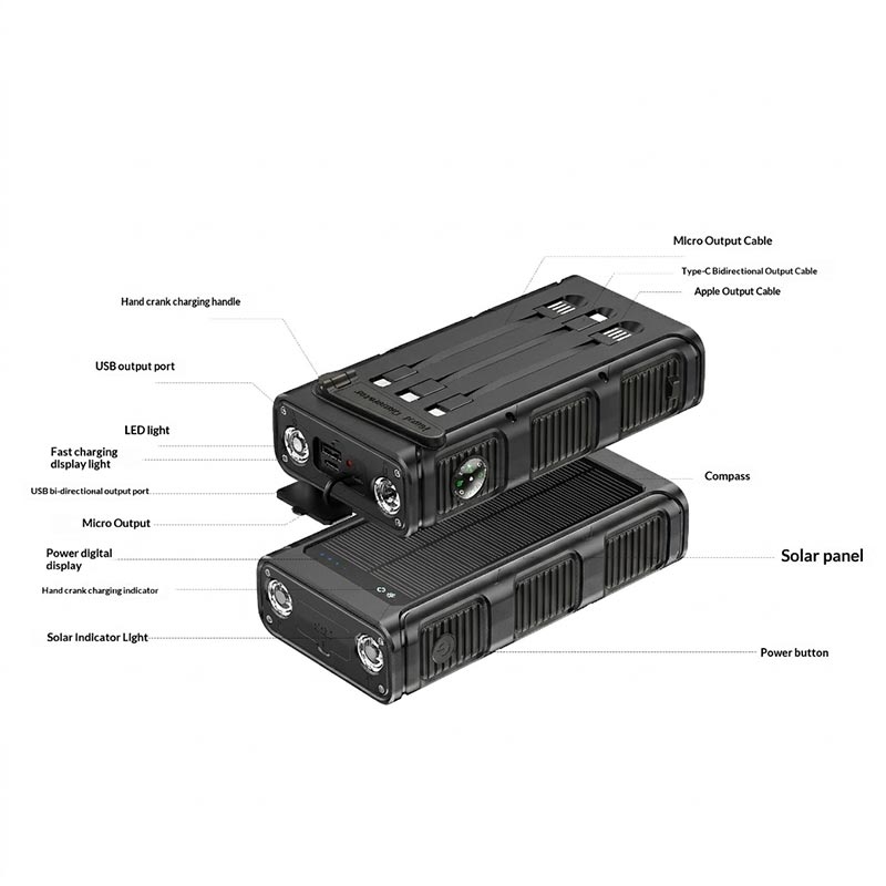 Batteriet med høj kapacitet på 30.000 mAh understøtter flere opladningscyklusser til telefoner, små gadgets og andre hverdagsapparater. Den har også PD 20W hurtigopladning, dobbelte udgangsporte og indbyggede Type-C-, Micro-USB- og Lightning-kabler, så du kan oplade mere bekvemt uden at skulle have ekstra ledninger med. For ekstra praktisk anvendelighed udendørs inkluderer den en lys LED-lommelygte, SOS-alarm og kompas.