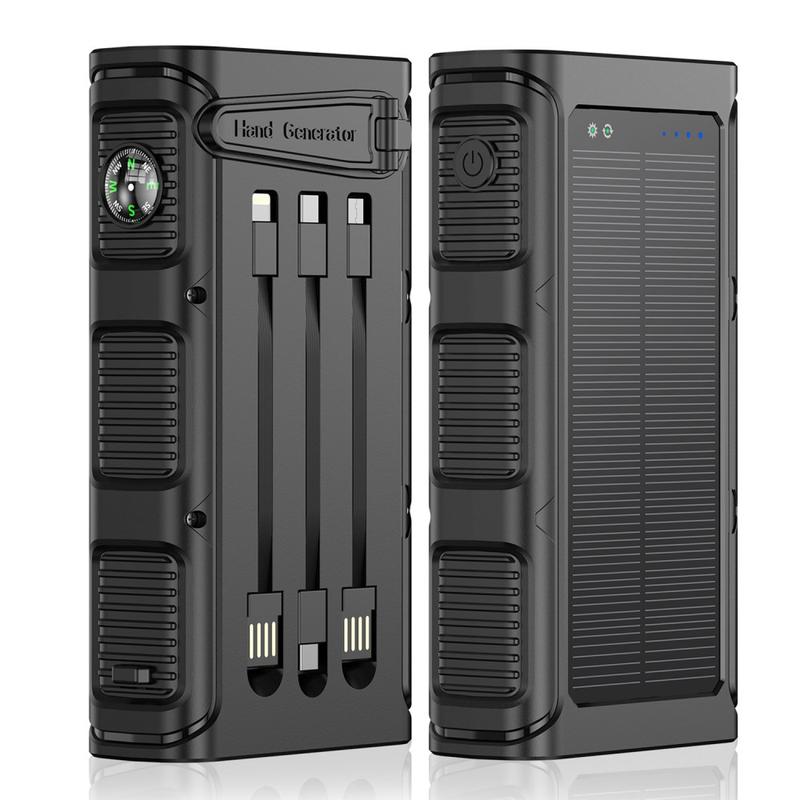 Solcelledrevet powerbank med håndsving, 30000mAh - PD 20 W hurtigopladning, bærbar oplader til udendørs brug med lommelygte, SOS-alarm, kompas og indbyggede kabler
