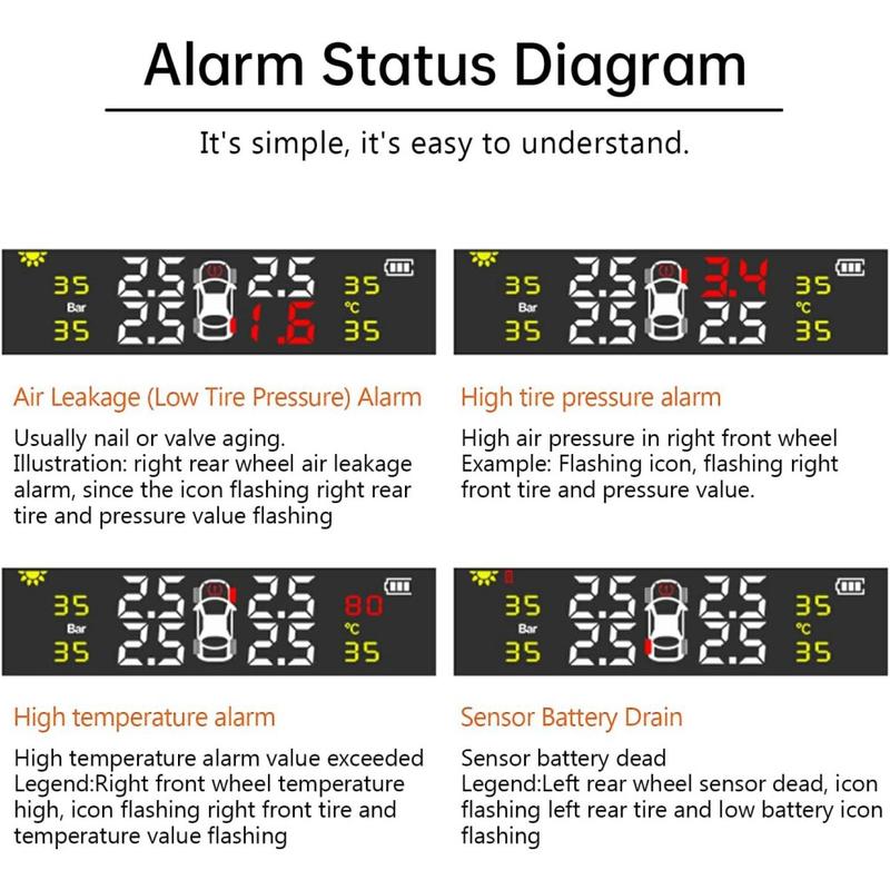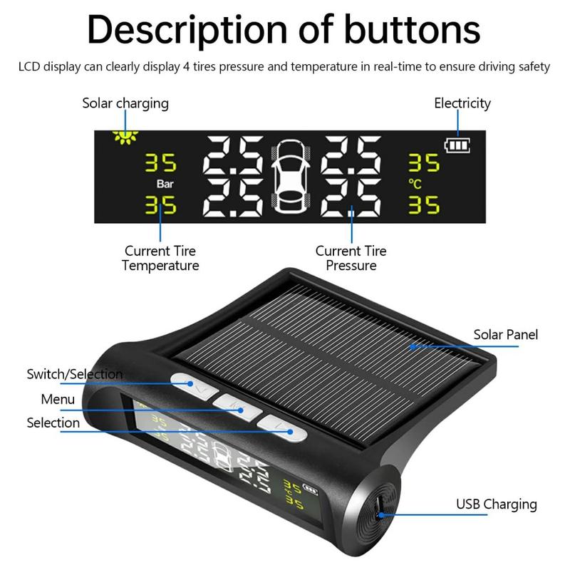 Hold hver eneste rejse jævn, effektiv og sikker. Denne solcelledrevne TPMS viser løbende det aktuelle dæktryk (BAR/PSI) og temperaturen for alle fire dæk og advarer dig, så snart værdierne bevæger sig uden for de sikre grænser. Ingen ledninger, intet gætteri - bare ubesværet ro i sindet på alle veje.