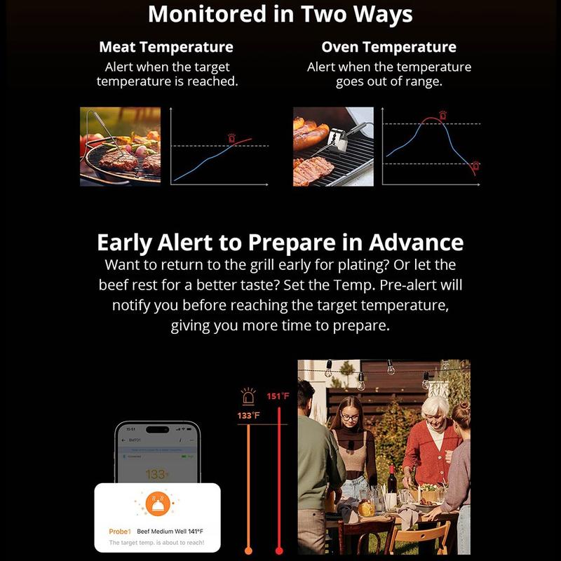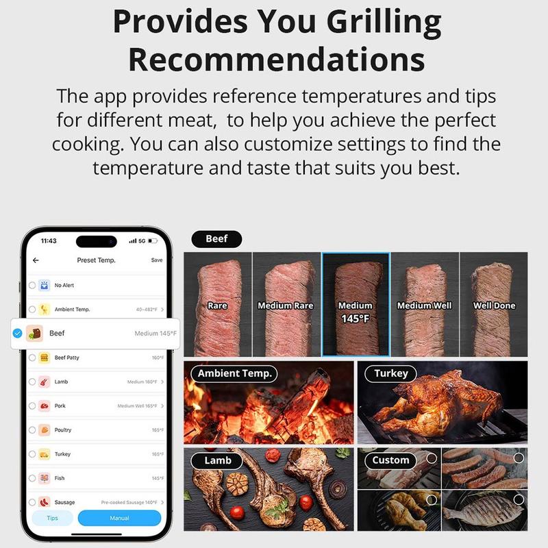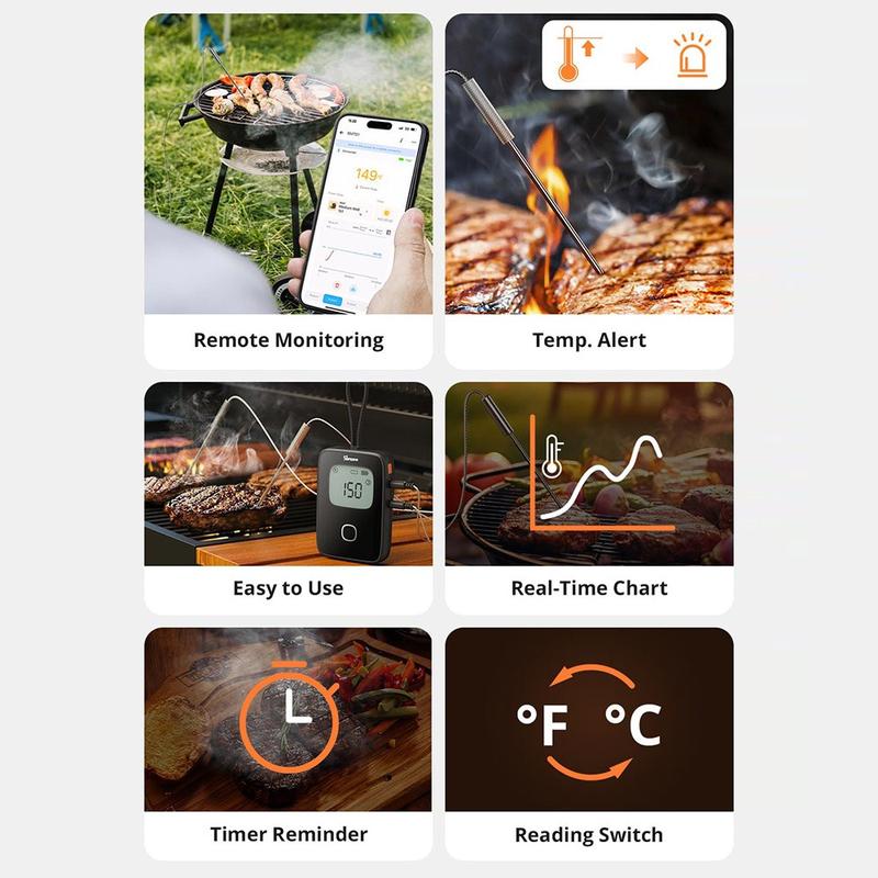 - Smart Bluetooth-overvågning: Hold dig opdateret om din mads kernetemperatur via et pålideligt Bluetooth-link til din smartphone - perfekt til multitasking i køkkenet eller underholdning af gæster.