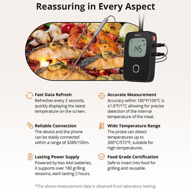 SONOFF BMT01 Kødtermometer forenkler forberedelsen af måltiderne med højpræcisions temperaturmåling og brugervenlig app-integration. Den robuste sonde og det lange kabel giver dig mulighed for at måle selv de største kødstykker nøjagtigt, mens du undgår sammenfiltrede ledninger i nærheden af åben ild. eWeLink-appens overvågnings- og advarselsfunktioner hjælper med at eliminere gætterier, hvilket sparer dig tid og reducerer risikoen for underkogte eller overkogte måltider.