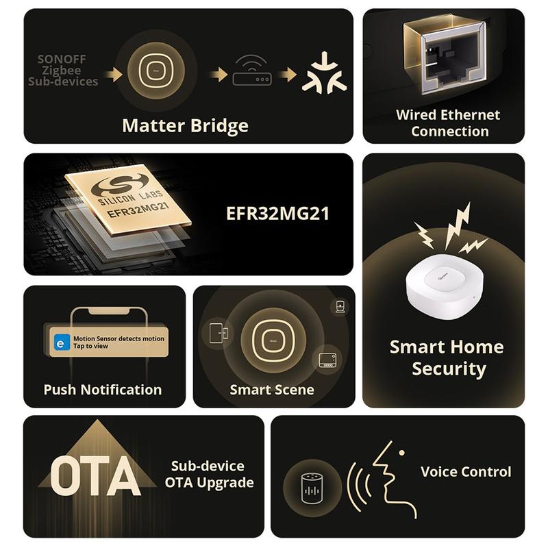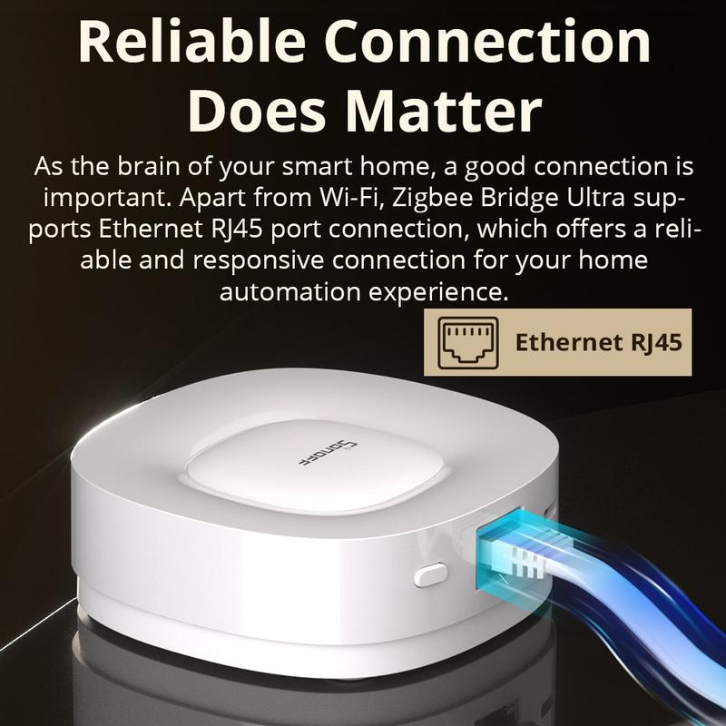 Saml dit smarte hjem-økosystem med Sonoff ZBBridge-U Zigbee Bridge Ultra. Denne avancerede gateway forbinder Zigbee 3.0-enheder til dit WiFi-netværk og understøtter Matter-bridge-funktionalitet, så kompatible Zigbee-enheder kan integreres problemfrit på tværs af forskellige smarte hjem-platforme. Med både WiFi- og kablet Ethernet-muligheder leverer den fleksibel og stabil forbindelse til pålidelig automatisering, sikkerhed og stemmestyring.