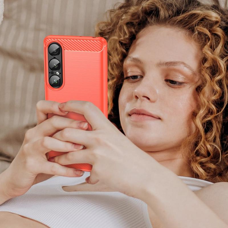 Sony Xperia 1 VII Børstet TPU Cover - Karbonfiber - rød