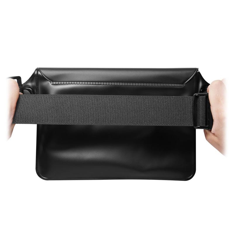 Det sikre låsesystem og ridsefaste materiale sikrer, at din telefon og andre genstande er sikret mod vandskader op til tredive meter under vandet. Derudover sikrer den justerbare elastiske rem en stram, men behagelig pasform, uanset om du bærer tasken rundt om din talje eller på tværs af kroppen.