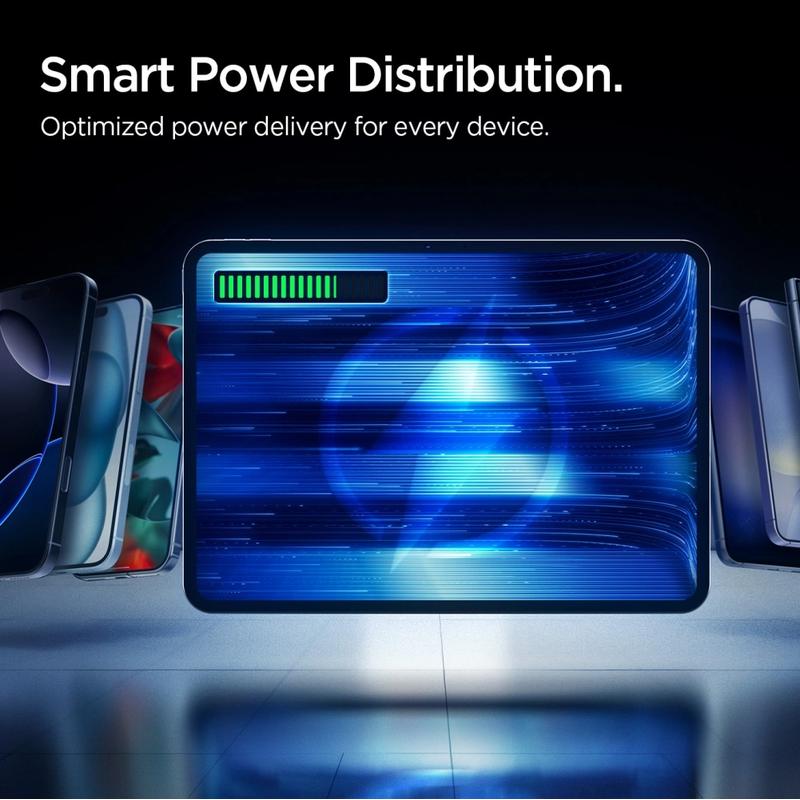 Det indbyggede IntelligentSafety-system beskytter mod overophedning, overspænding og kortslutning. Realtidsovervågning af strøm, spænding og temperatur sikrer sikker og pålidelig opladning af alle dine enheder.