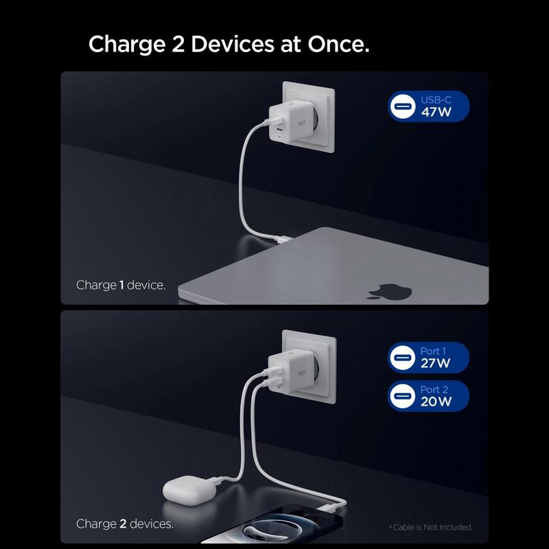 Spigen Essential EE472EU er en kraftfuld og kompakt GaN Pro-vægoplader, der er designet til at hurtigoplade to enheder samtidigt og samtidig opretholde en sikker, intelligent strømstyring. Den har to USB-C-porte og justerer automatisk output afhængigt af, hvor mange enheder der er tilsluttet: en enkelt enhed kan trække hele 47W fra USB-C(1), mens to tilsluttede enheder får et effektivt delt output på 27W + 20W.