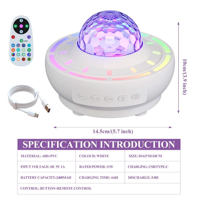 SSL001-C Bærbar stjerneprojektorlampe - 12-mode RGB, Bluetooth 5.0-højttaler og 2 400 mAh USB-opladeligt batteri