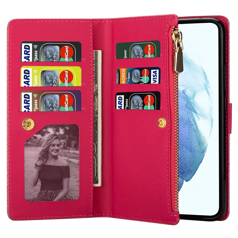 Klæd din Samsung Galaxy S22+ 5G på med denne skønne coverpung med masser af praktiske lommer. Denne coverpung er boostet med en stødsikker inderside af TPU, som sikrer en helt fantastisk beskyttelse mod buler og revner. Udover at have flere lommer til kort og kontanter, har denne coverpung også en lynlåslomme, som lader dig opbevare mønter eller andet. Det skinnende design får din Samsung Galaxy S22+ 5G til at se endnu mere forbløffende ud, mens den aftagelige rem gør det nemt for dig at bære rundt på den.