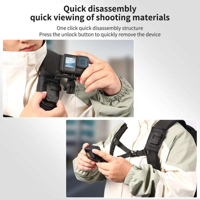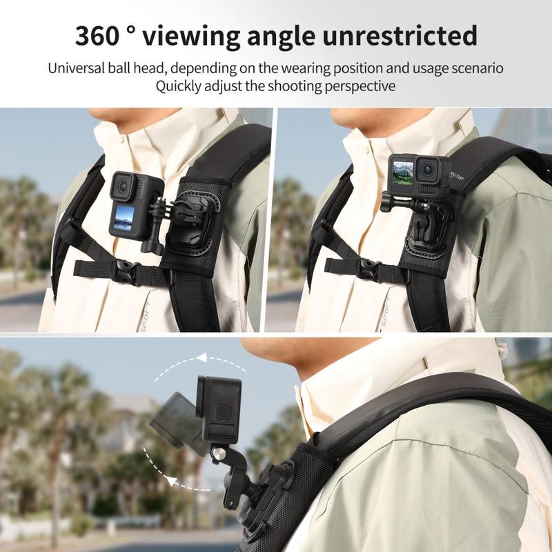 Beslaget har også et universelt kuglehoved til fleksibel vinkeljustering, hvilket gør det nemmere at placere dit kamera til POV-optagelser eller sidevinkeloptagelser, afhængigt af hvordan du bærer din rygsæk. Med sit lette design, holdbare nylon- og fiberkonstruktion og hurtigudløserfunktion er det et praktisk tilbehør til kreative og udendørsbrugere, der ønsker nemmere mobil filmning.