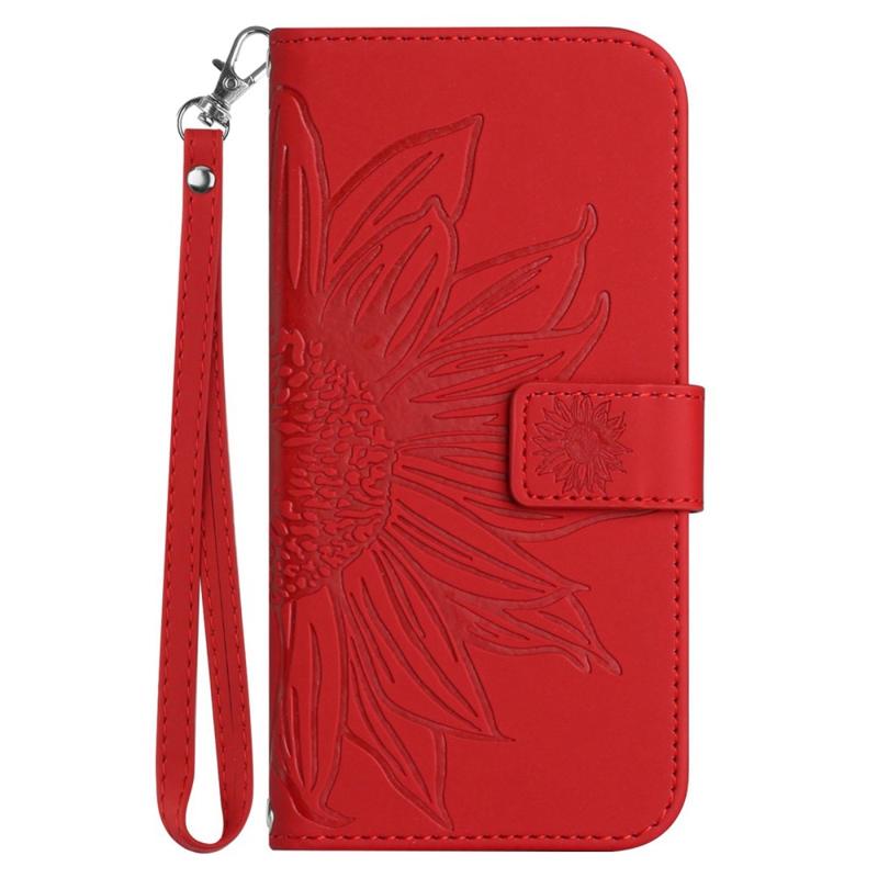 Stødsikkert Flip Cover til iPhone 14 Pro Max, HT04 præget solsikkestativ PU-læder Magnetisk pungbetræk med rem
