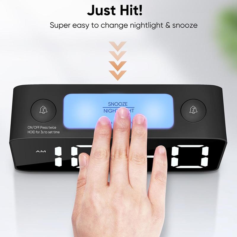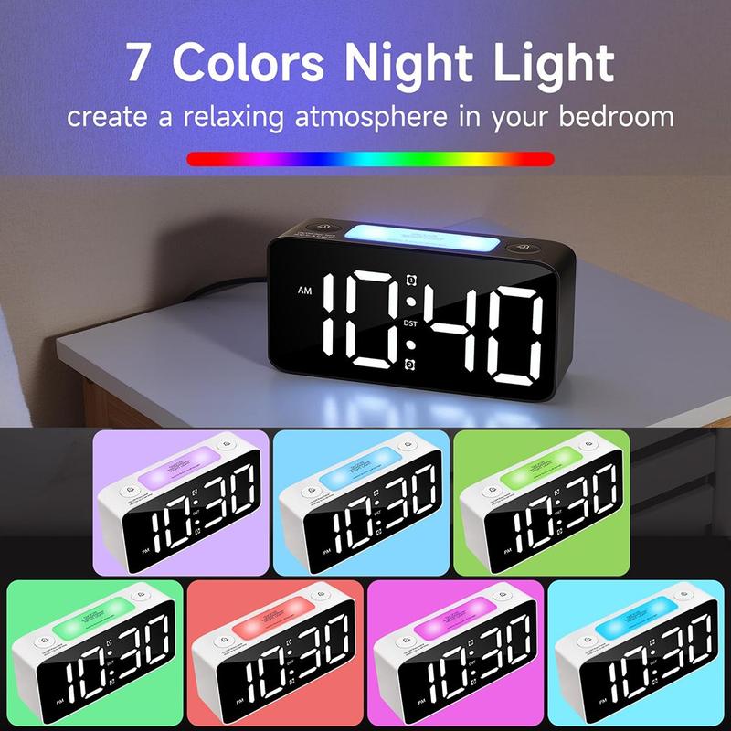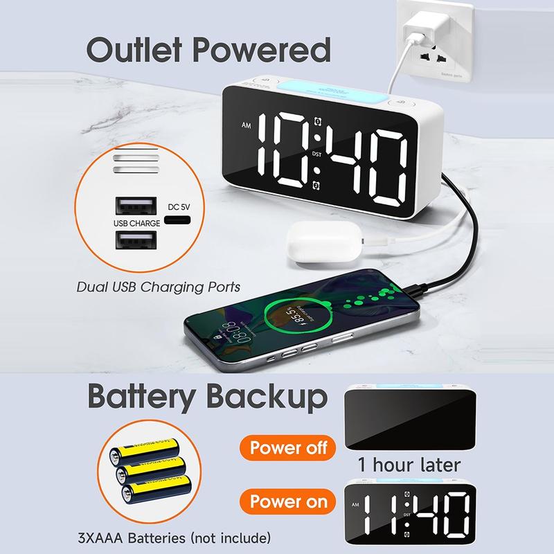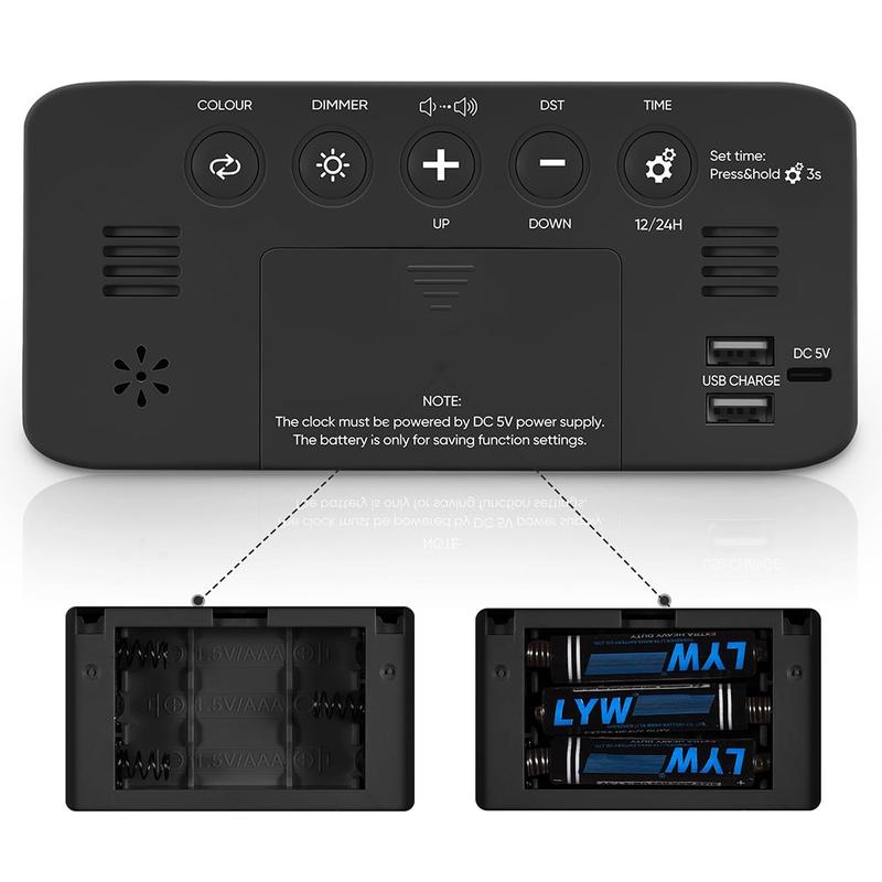 - Yderligere funktioner: Inkluderer en 9-minutters snooze-funktion, 12/24-timers tidsformat, justering af sommertid og to DC 5V/1A USB-udgangsporte til sikker opladning af dine enheder ved sengen.