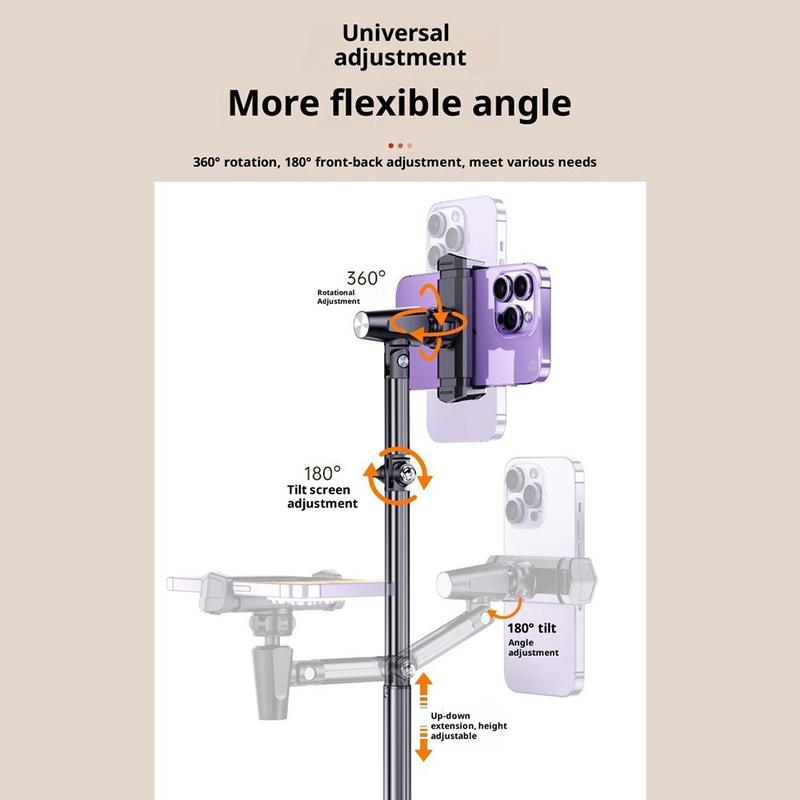 - Justerbar højde og vinkel - Den udtrækkelige metalstang giver mulighed for alsidig positionering og den perfekte vinkel til overhead-optagelser, livestreams eller skrivebordsoptagelser.