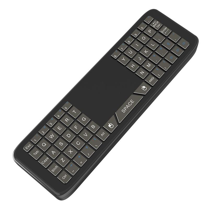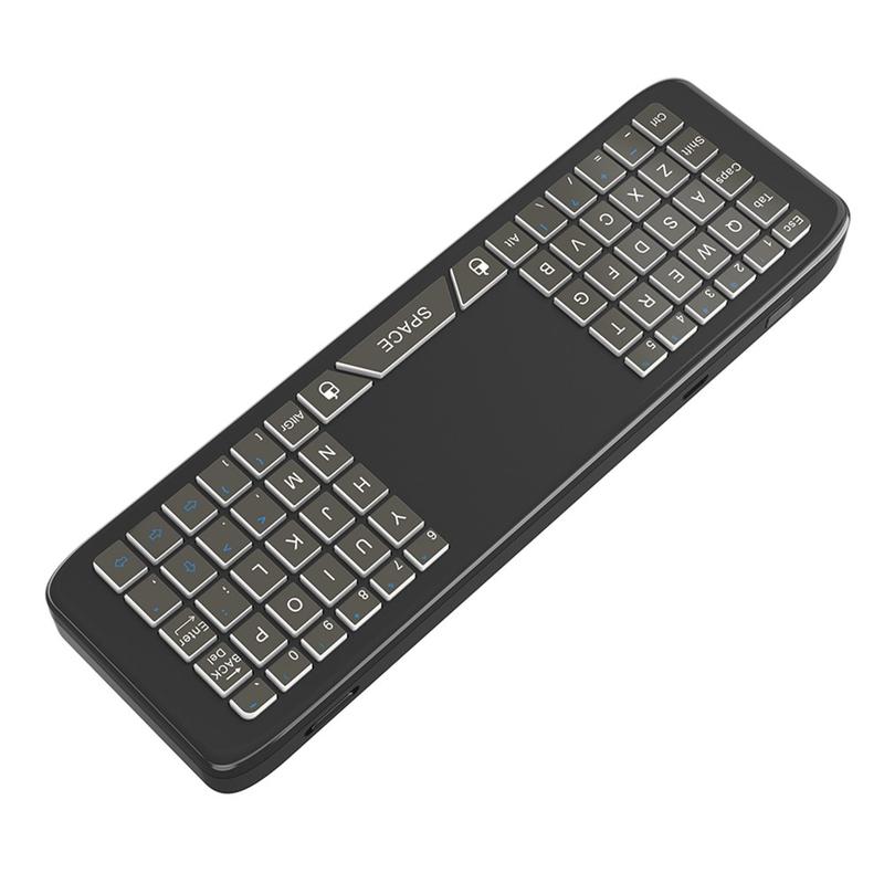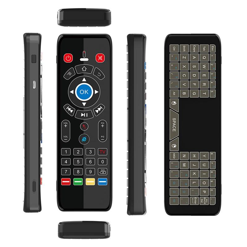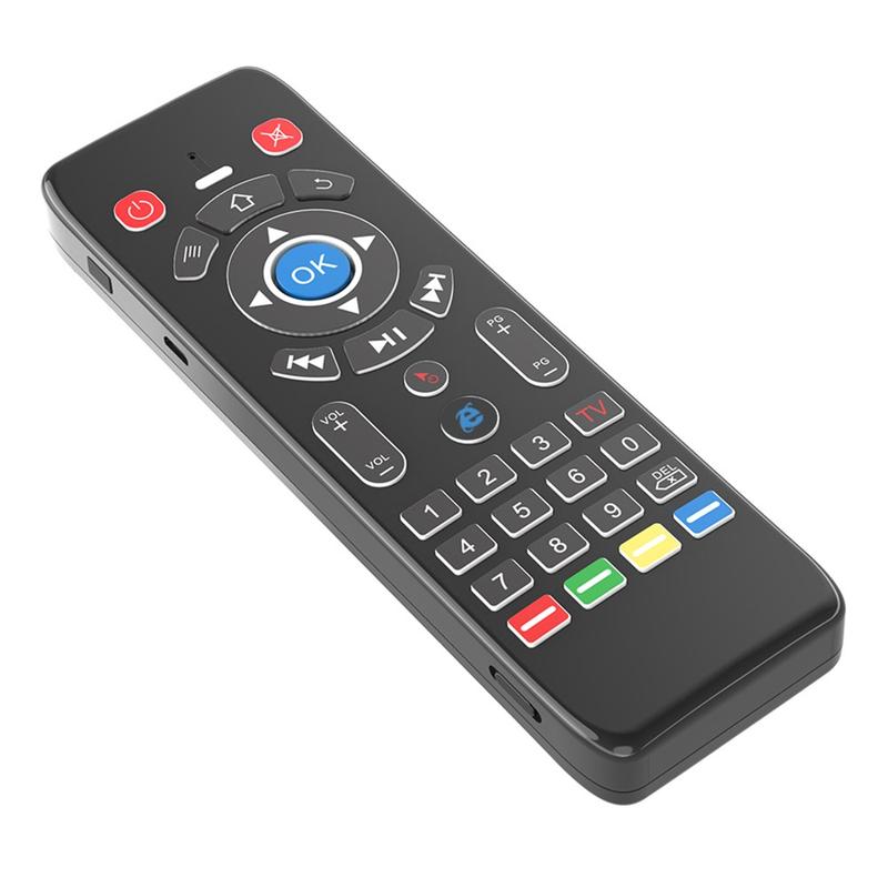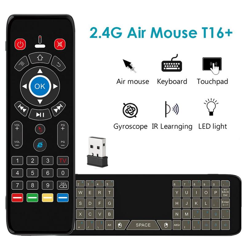 Den trådløse fjernbetjening T16+ kombinerer flere kontrolmetoder i én kompakt enhed: gyroskopisk luftmus, touchpad, fuldt QWERTY-tastatur og 5-tasters IR-læring. Den er designet til at erstatte flere controllere og forenkle navigationen på tværs af smarte enheder.