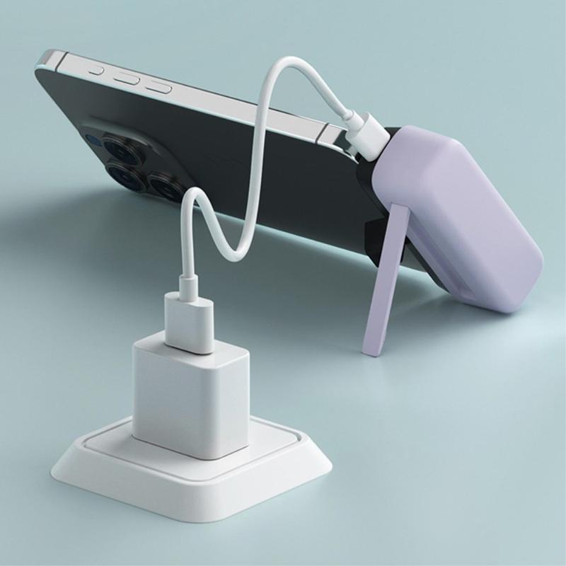 Det er ikke kun en bærbar minioplader, men den har også en standerfunktion, som kan bruges som mobiltelefonholder.