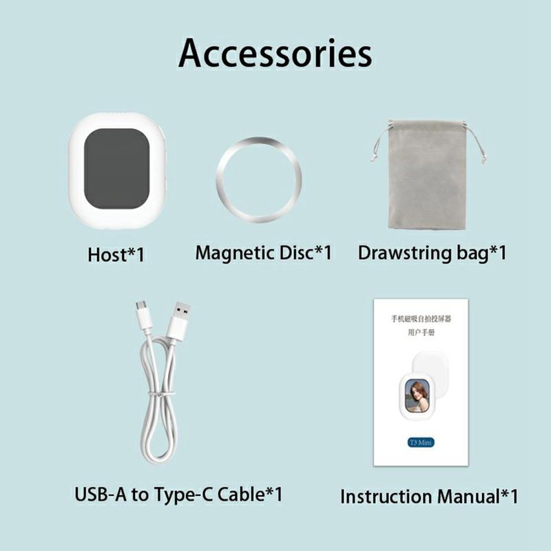 T3 Mini er en trådløs enhed til skærmspejling, der er udviklet til at gøre det nemmere at tage selfies, lave vlogs, skabe indhold og tage billeder med bagkameraet. Med øjeblikkelig magnetisk fastgørelse, trådløs skærmspejling og en lys 2,01-tommer IPS-skærm hjælper den dig med at få et forhåndskig på din telefons bagkamera i realtid uden kompliceret opsætning. Det lette design gør den nem at have med overalt, hvilket gør den til et nyttigt værktøj til hverdagsfotos, korte videoer, livestreams og rejseindhold.