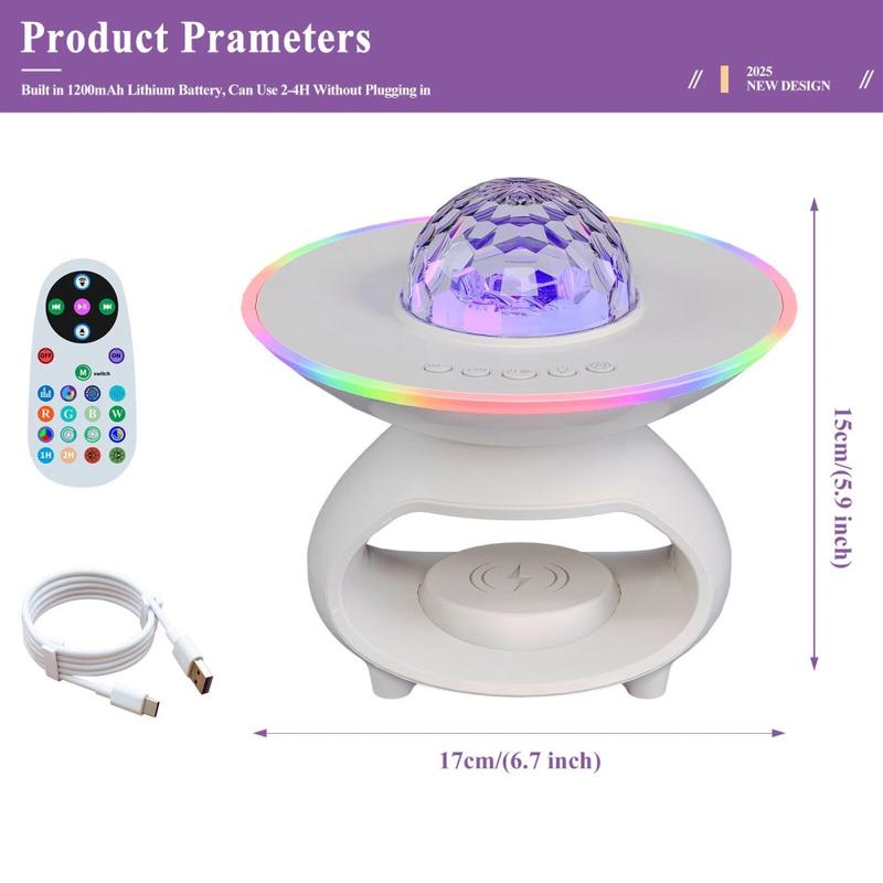 Tilføj atmosfære, lyd og ubesværet opladning til enhver seng eller arbejdsplads. TCSP-001-C projicerer en galakse af farver, streamer musik via Bluetooth-kompatibel 5.0 og oplader din telefon uden ledning - alt sammen i et kompakt, USB-opladeligt design med praktisk fjernbetjening.
