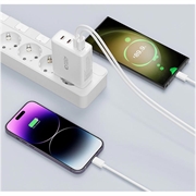 vægoplader, der giver dig mulighed for effektiv og samtidig opladning af flere enheder. Den har tre USB-C-porte og en USB-A-port for din bekvemmelighed. Den leverer en effekt på 100W, hvilket giver dig mulighed for at oplade de fleste mobile enheder, såsom smartphones, tablets og bærbare computere, hurtigt. USB-C-portene understøtter Power Delivery (PD)-protokollen, mens USB-A-porten er kompatibel med Quick Charge 3.0 (QC3.0)-teknologi.