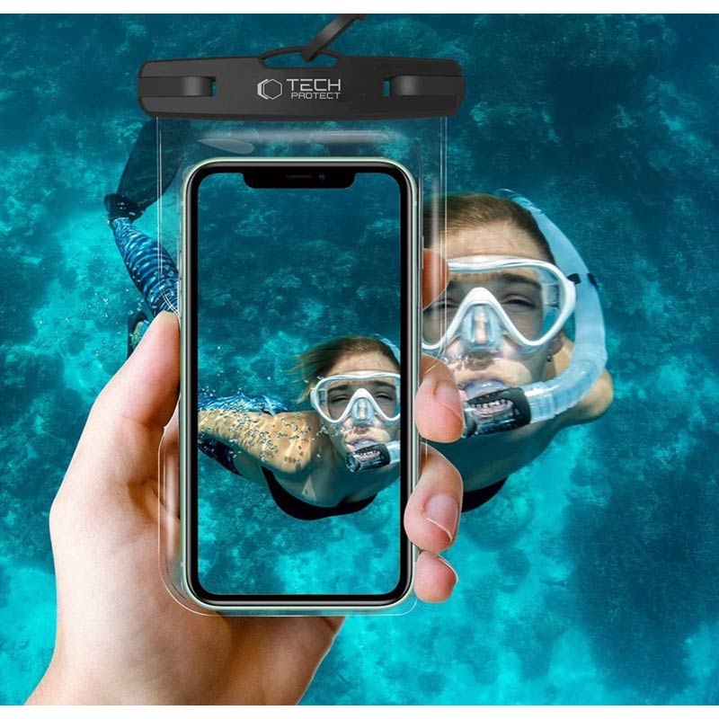 Dyk ned i dine sommereventyr, mens Tech-Protect's vandtætte cover holder din smartphone sikker og sund. Dette IPX8-klassificerede universelle cover garanterer fuldstændig beskyttelse mod vand, støv eller salt, mens dets fuldt gennemsigtige design giver dig mulighed for at tage nogle uforglemmelige undervandsbilleder på dine sommerture. Coveret er lavet af et fleksibelt, blødt materiale, der ikke forstyrrer den almindelige og bekvemme brug af din smartphone.