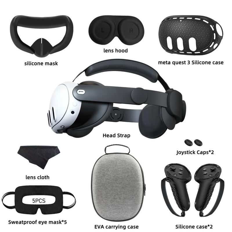 Tilbehørssæt i 9 dele til Meta Quest 3: hovedrem, EVA-opbevaringsetui, silikonehåndtagsovertræk og meget mere - sort