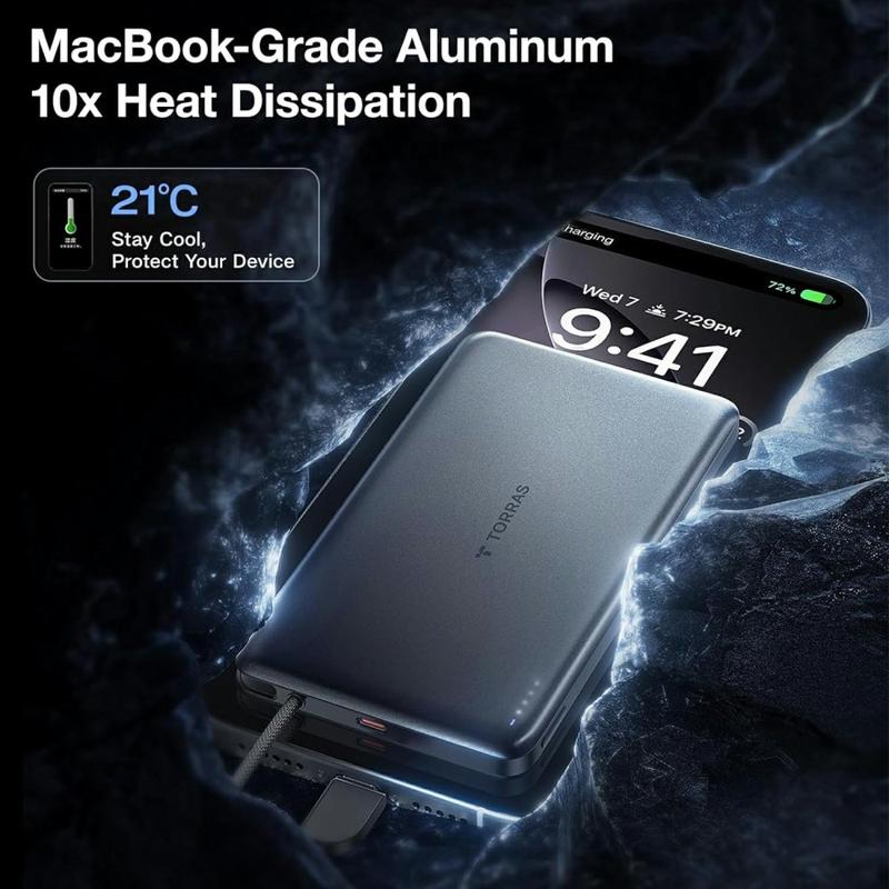 Torras Mini Slim PD Powerbank med indbygget USB-C-kabel - 22,5 W hurtigopladning, 10000mAh
