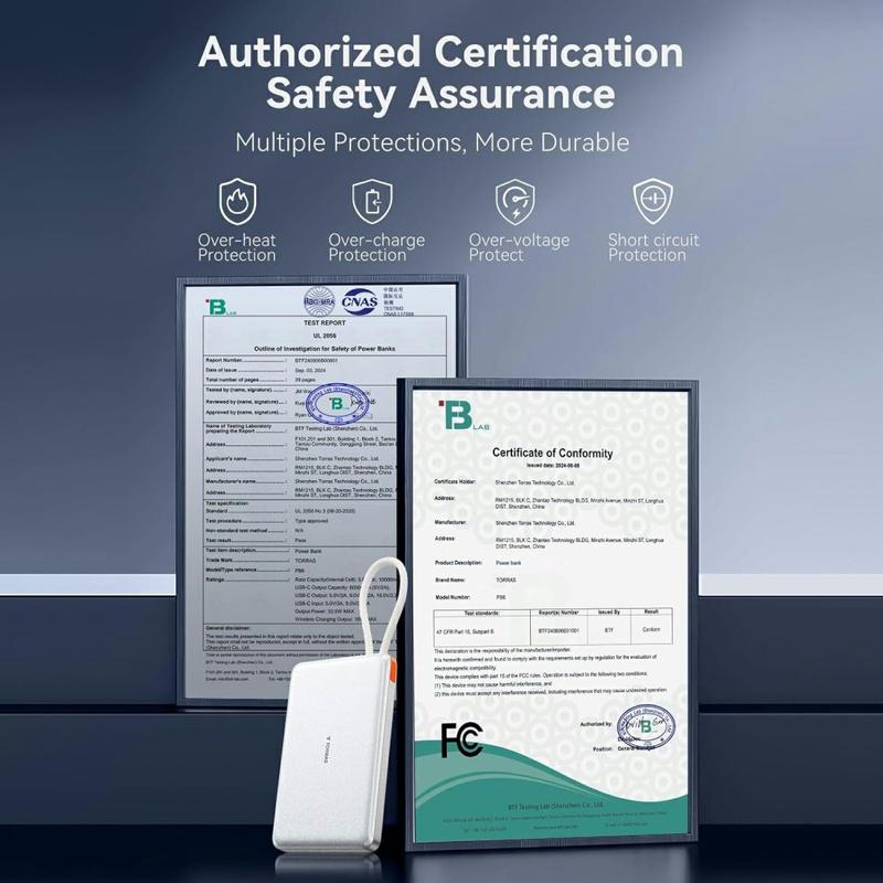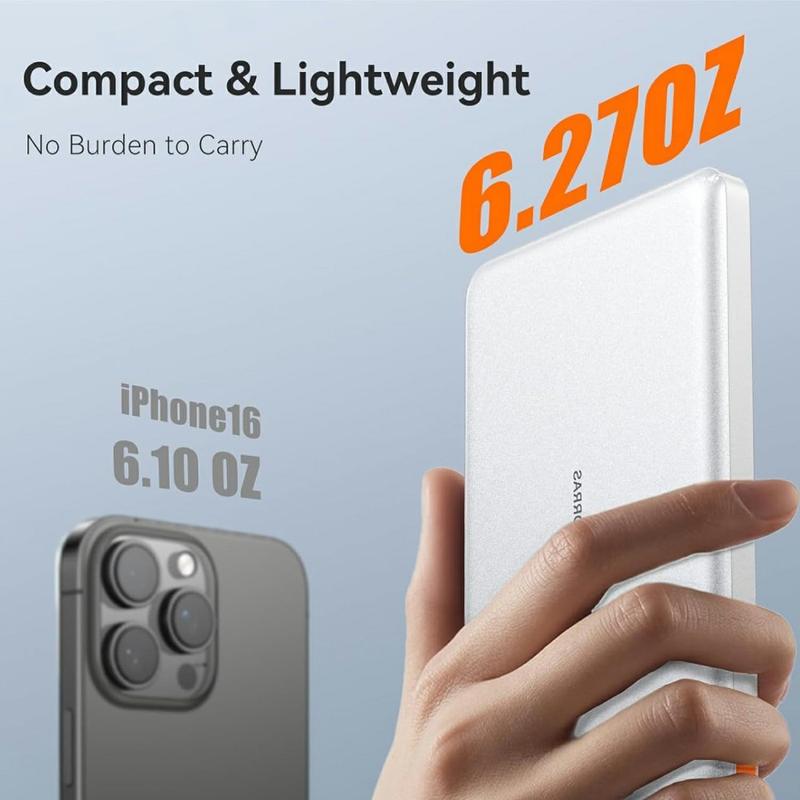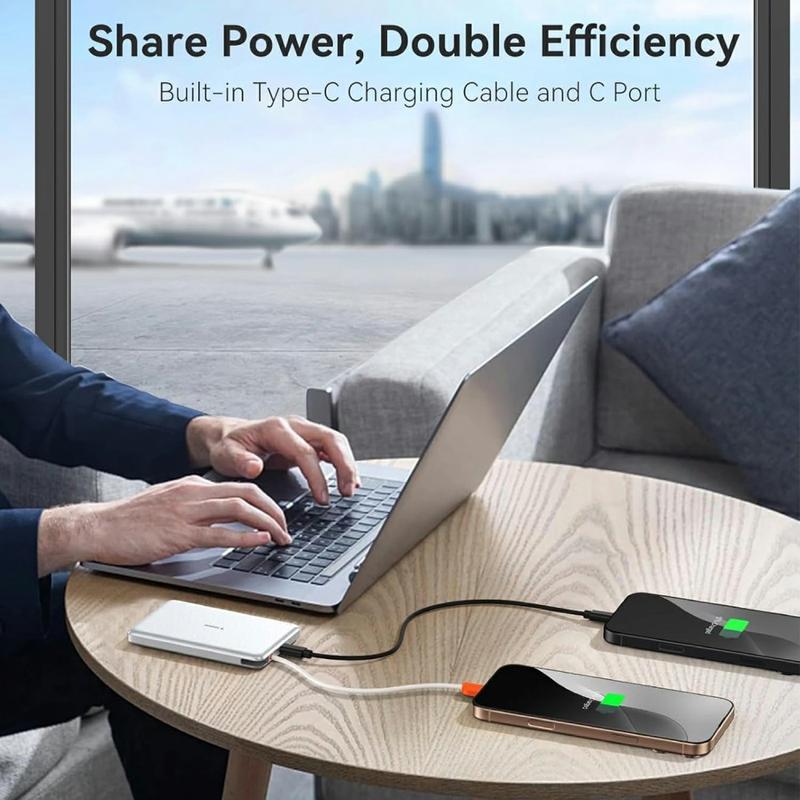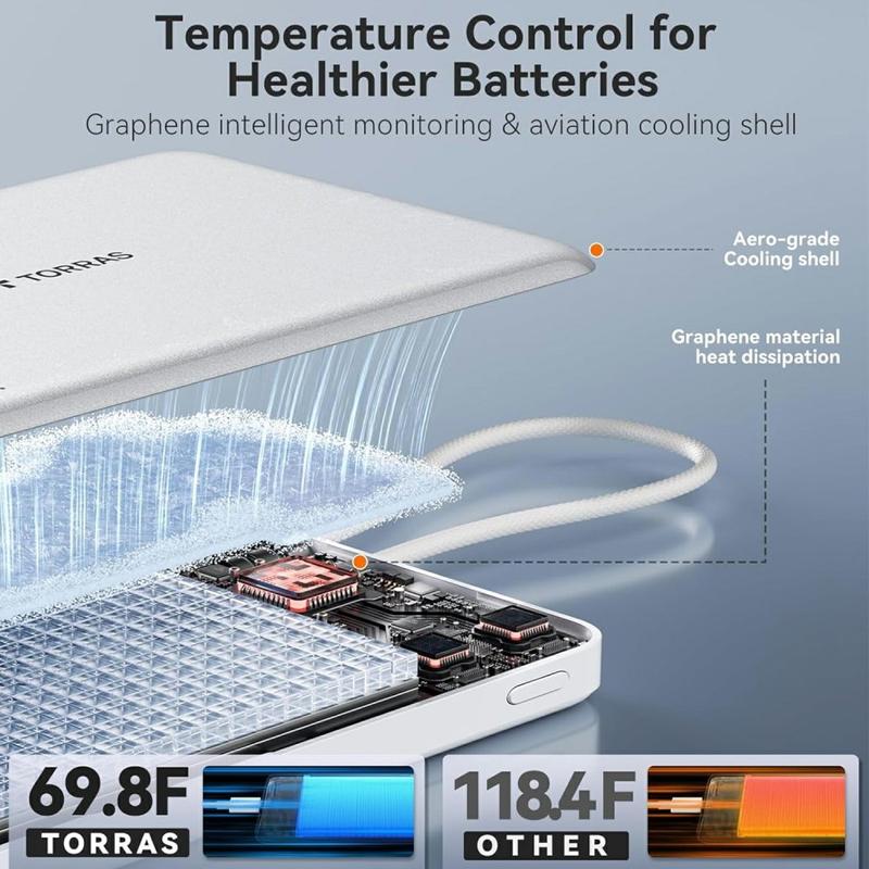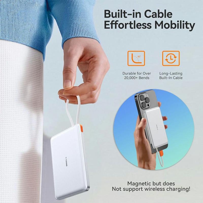 Torras Mini Slim PD Powebank med indbygget USB-C-kabel - 22,5 W hurtigopladning, 10000mAh