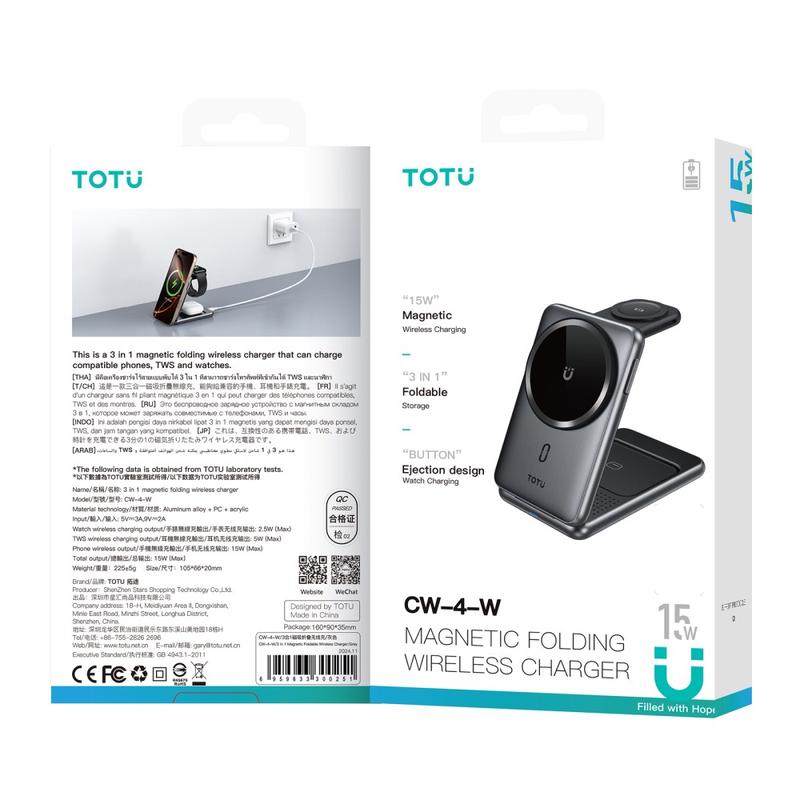 TOTU CW-4-W eliminerer behovet for flere opladere ved at kombinere alle dine vigtige ting i én enhed. Det kompakte, foldbare design gør den ideel til rejser, mens hurtig trådløs opladning sikrer, at du ikke kommer til at vente. Førsteklasses byggekvalitet garanterer holdbarhed og stil, hvilket gør den til et pålideligt valg for moderne brugere.